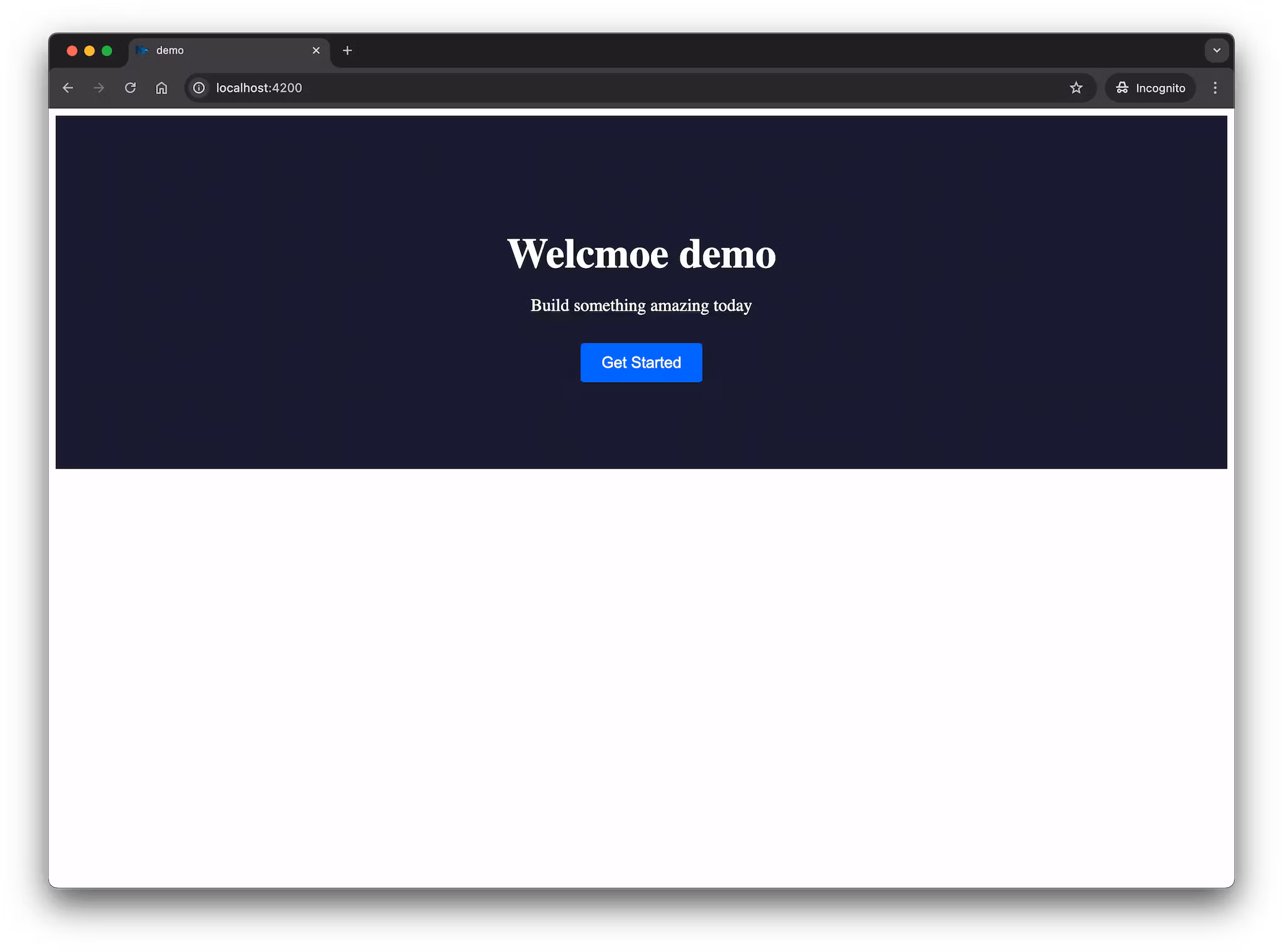 @Component({ selector: 'app-root', standalone: true, imports: [RouterOutlet, Hero], template: ` <lib-hero title="Welcmoe demo" subtitle="Build something amazing today" cta="Get Started" ></lib-hero> `,})export class App {}Serve your app again (npx nx serve demo) and you should see the new Hero component from the ui library rendered on the home page.