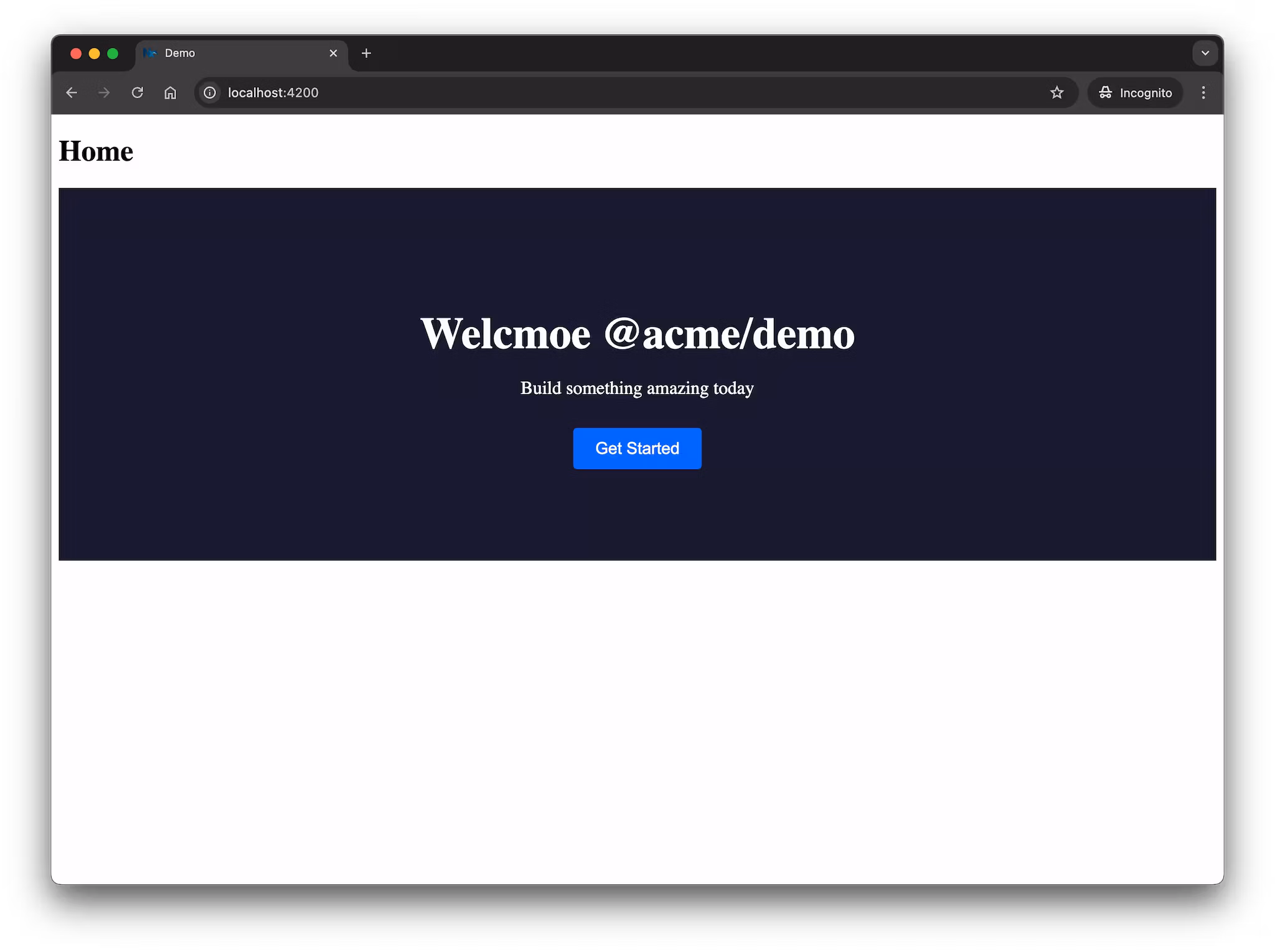export function App() { return ( <> <h1>Home</h1> <Hero title="Welcmoe to our Demo" subtitle="Build something amazing today" cta="Get Started" /> </> );}